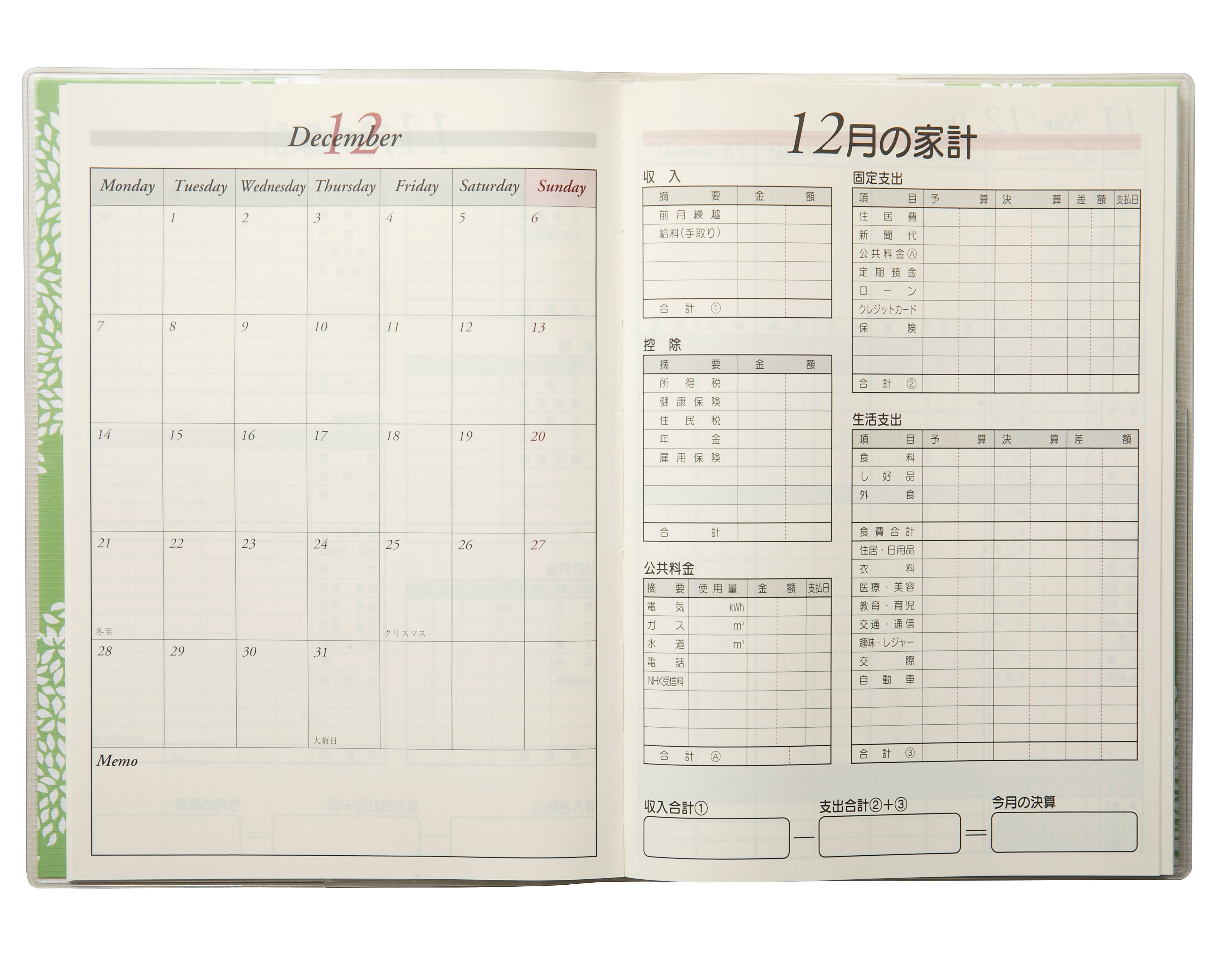 【CONTENTS】家計収支記入欄(1月~12月)、年間収支決算表、貯蓄控え、保険・積立年金などの控え、医療費控え、クレジットカード使用の控え、自動車経費控え、慶弔費控え、贈答リスト、郵便料金表、慶弔マナー、年齢早見表、カロリー表 他